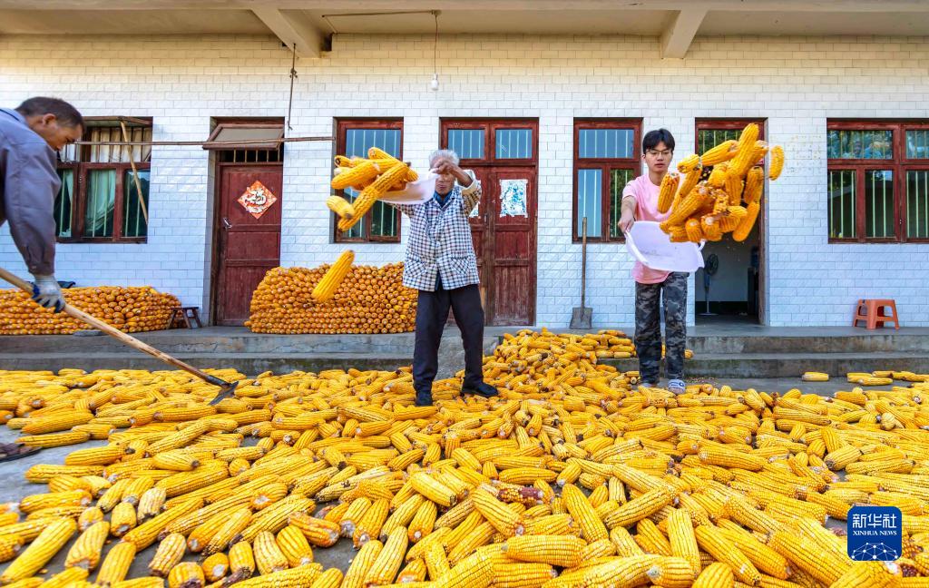 8月31日,村民在貴州省黔西市觀音洞鎮觀音洞社區晾曬玉米。