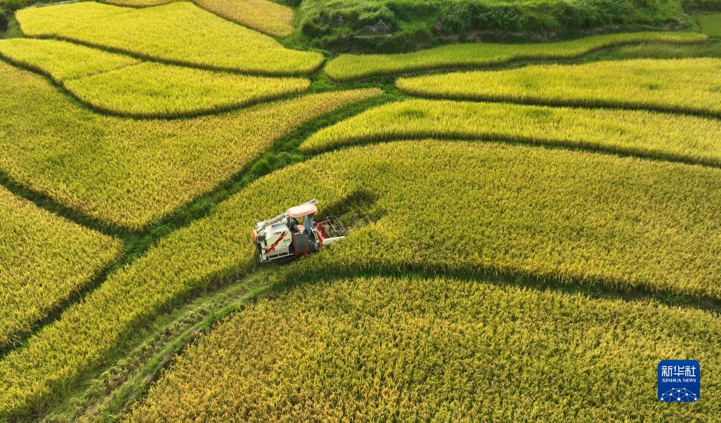 8月31日,在湖南省懷化市通道侗族自治縣雙江鎮馬龍村,村民在田間收割稻穀(無人機照片) 。