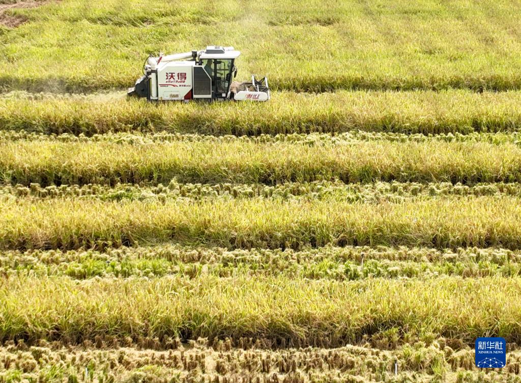 8月31日,在湖南省永州市道縣清塘鎮樓田村,農機手駕駛農機在收割水稻(無人機照片)。