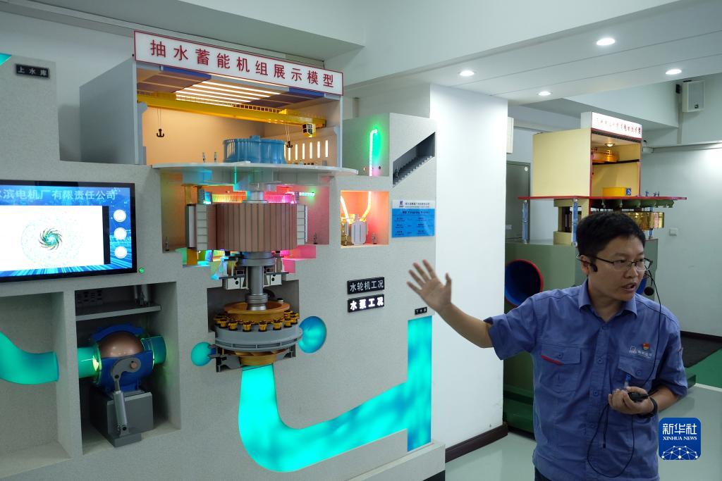 8月31日,哈電集團哈爾濱電機廠有限責任公司總專業師王煥茂在水力發電設備實驗室介紹抽水蓄能機組工作原理。作為我國發電設備製造業的領軍企業,70多年來,哈電集團堅持科技領先和轉型升級,創下了涵蓋水電、火電、核電等領域200多項“中國第一”。