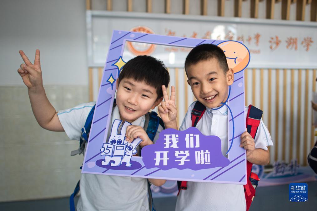 9月1日,湖北省武昌實驗中學沙湖學校學生步入校園後合影。