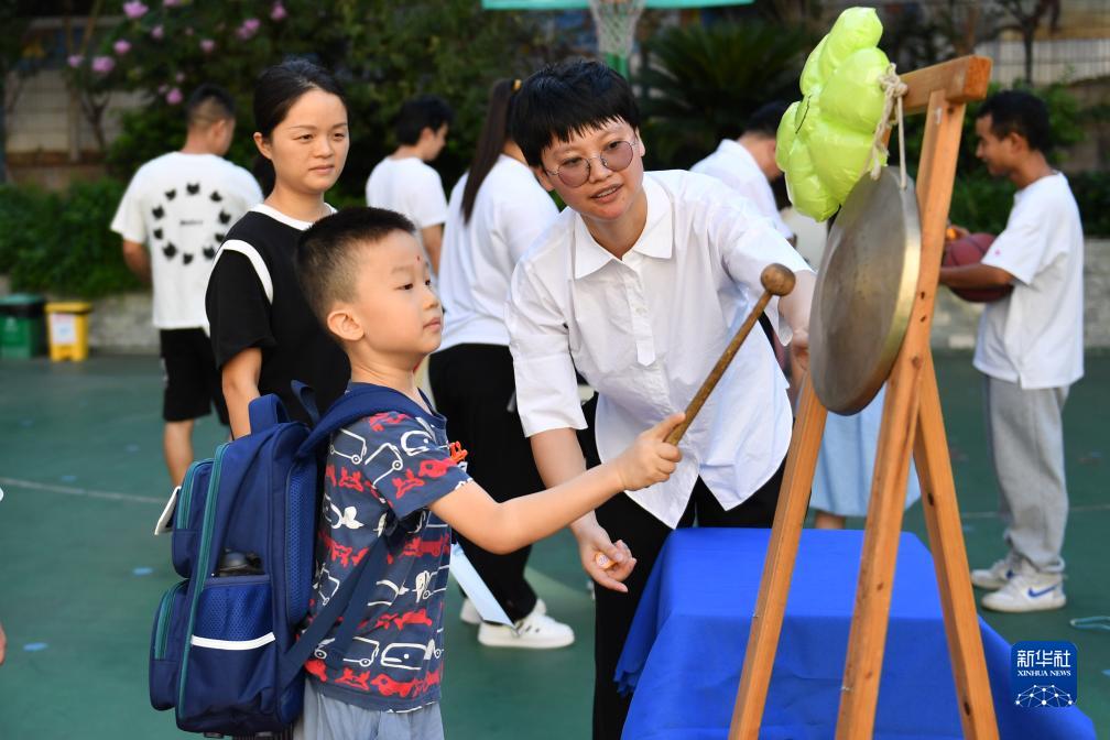 9月1日,在湖南省長沙市天心區沙湖橋小學,一年級新生在敲鑼,寓意擊鼓“鳴”志。