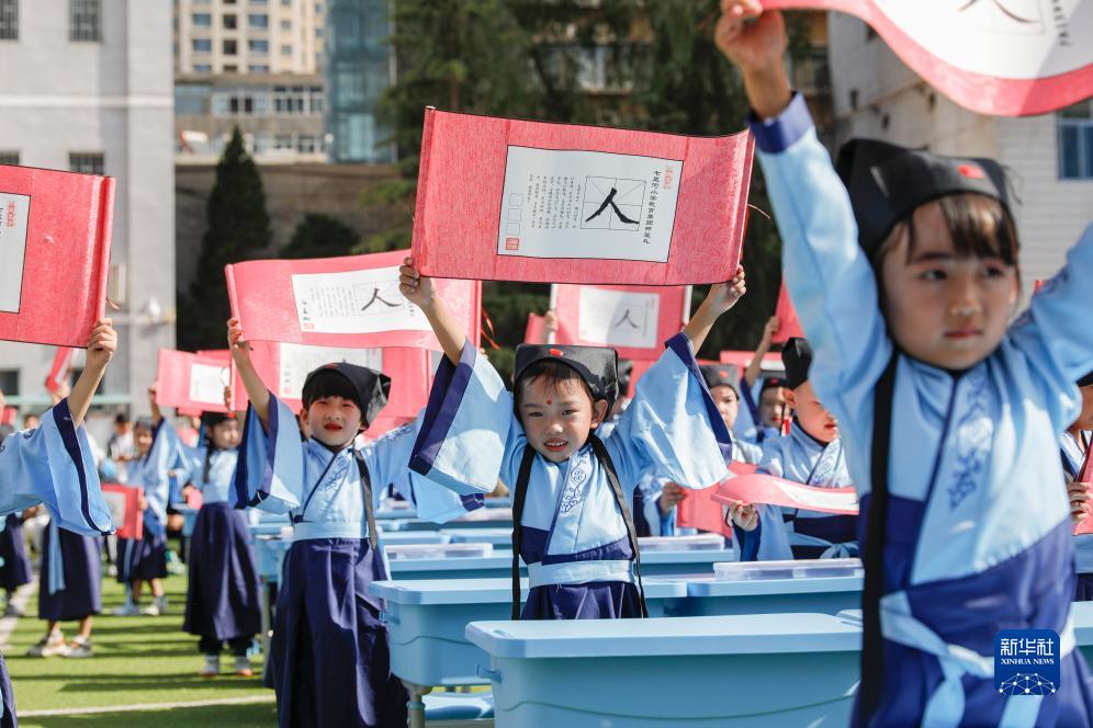 9月1日,在甘肅省蘭州市七里河區第二小學,一年級新生展示書寫的“人”字。