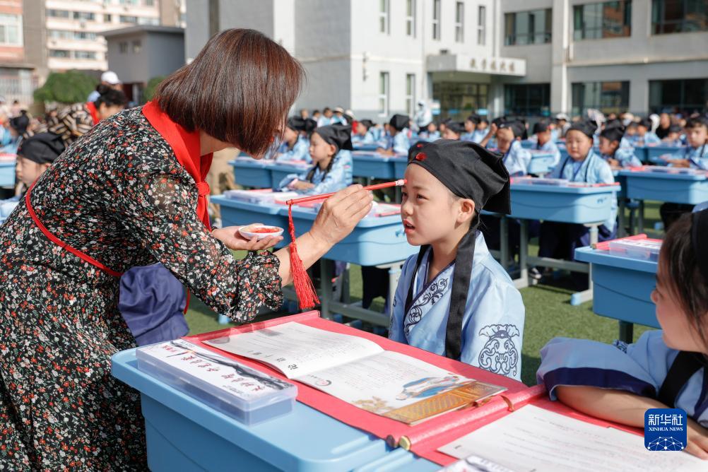 9月1日,在甘肅省蘭州市七里河區第二小學,老師在為一年級新生點硃砂啟智。