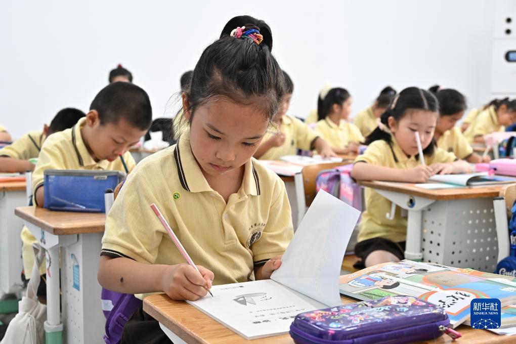 9月1日,北京第二實驗小學涭水河分校二年級1班的學生在新課本上寫上自己的名字。