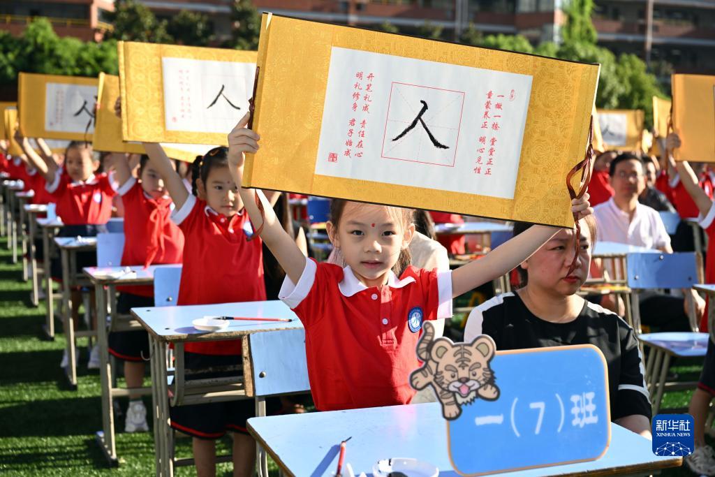 9月1日,在合肥市師範附屬第二小學,一年級新生展示自己在“開筆禮”儀式上用毛筆寫的“人”字。