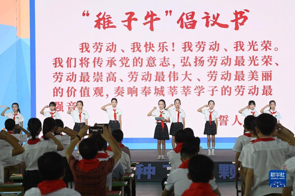 9月1日,浙江省寧波市奉化區錦屏中心小學的學生在“開學第一課”上宣讀勞動倡議書。