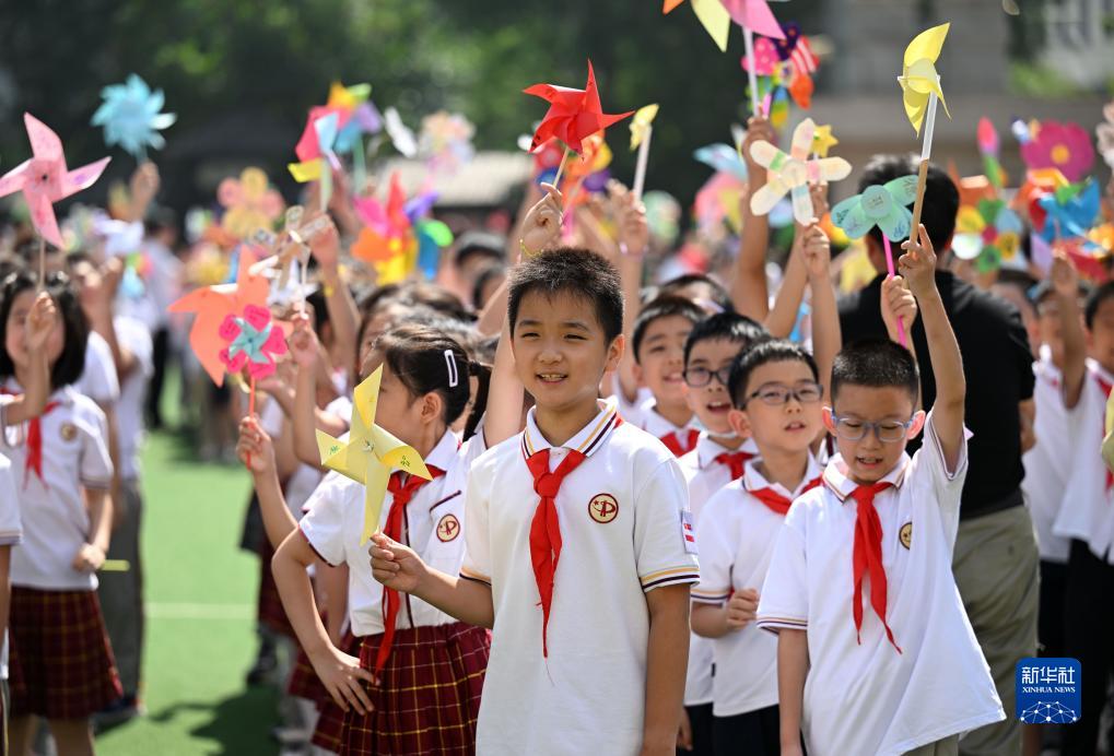 9月1日,在天津市和平區中心小學,學生們在開學典禮上旋轉自己製作的風車。