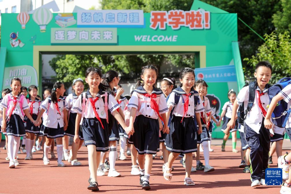 9月1日,在安徽省淮北市第三實驗小學,學生們背着書包陸續走進校園。