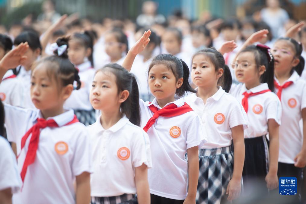 9月1日,湖北省武昌實驗中學沙湖學校學生在升旗儀式上。