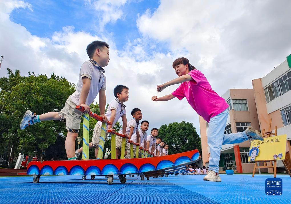 9月1日,浙江省寧波市鎮海區澥浦鎮中心幼兒園小朋友跟隨老師學習當地民俗運動“旱地泥艋”。