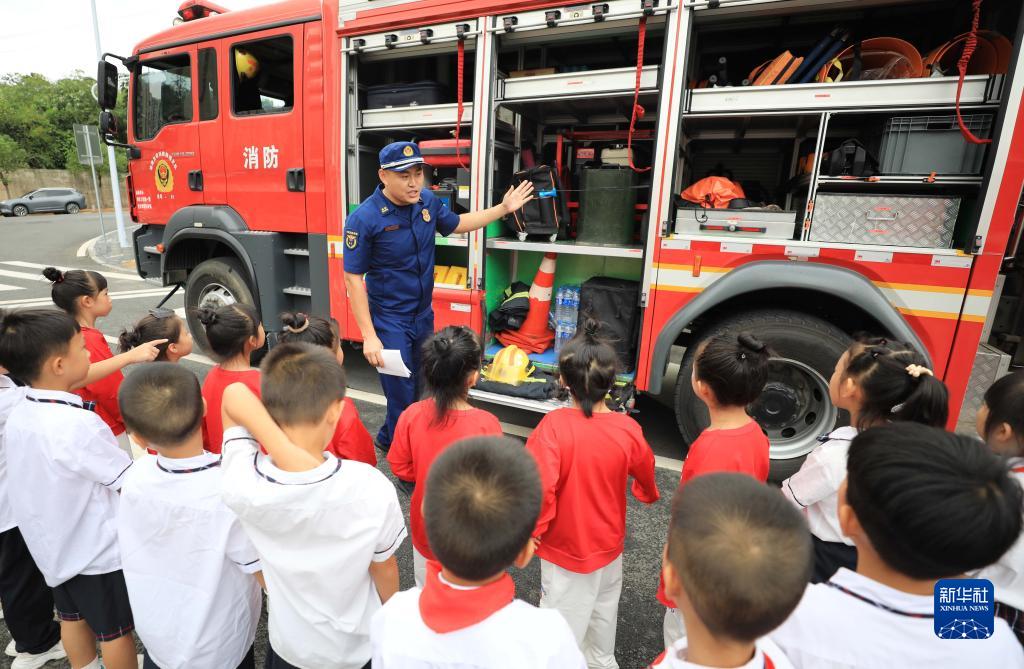 9月1日,在福建省龍岩市第二實驗小學,新生在消防員的講解下了解消防車輛器材知識。