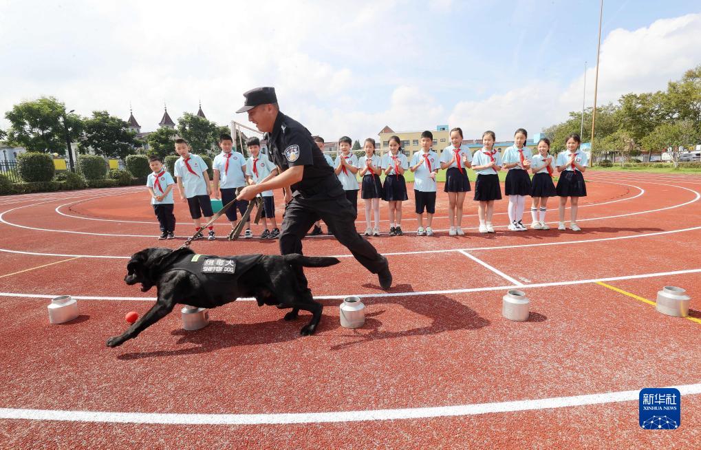 9月1日,在浙江省湖州市德清縣禹越鎮徐家莊中心小學“開學第一課 禁毒進校園”宣傳活動上,德清縣公安局禹越派出所一隻緝毒犬在進行嗅毒表演。