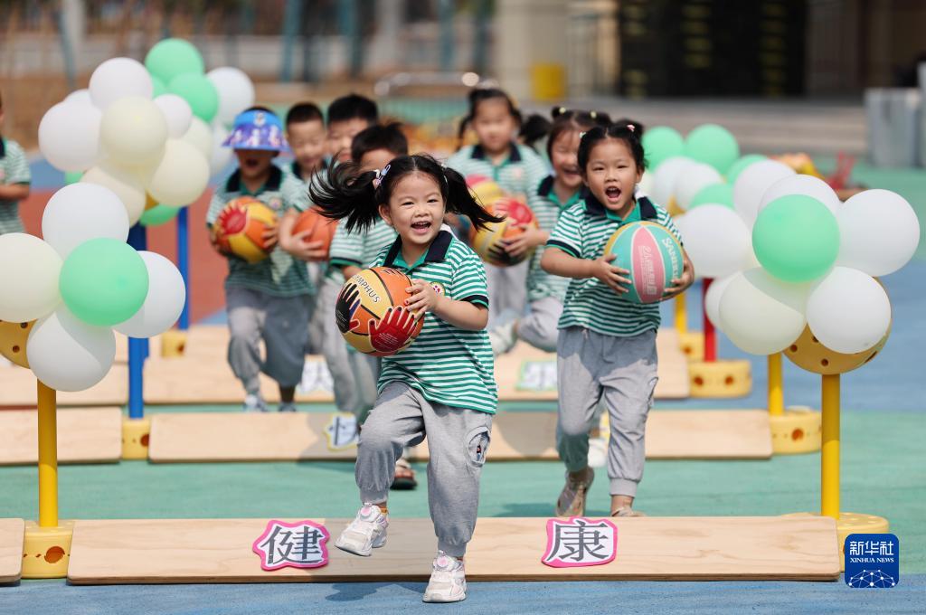 9月1日,在山東省臨沂市沂南縣第二實驗幼兒園,孩子們參加“趣味跨欄”游戲。