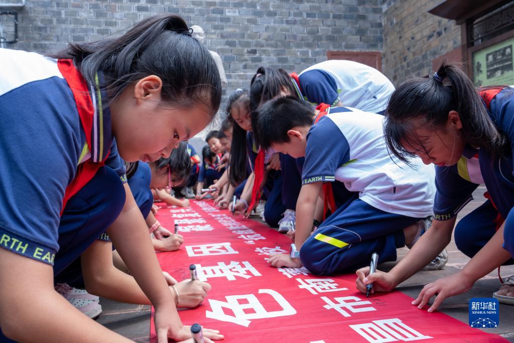 9月1日,在“東京審判”中國大法官梅汝璈故居,參加“開學第一課”的南昌市青雲譜區南菁學校學生在“賡續紅色基因、凝聚復興力量”橫幅上簽名。