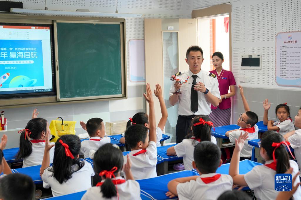 9月1日,在全國航空特色學校重慶市九龍坡區鐵路小學開學第一課的課堂上,來自重慶航空的飛行員李蒙邑用飛機模型向學生們講解飛行原理。