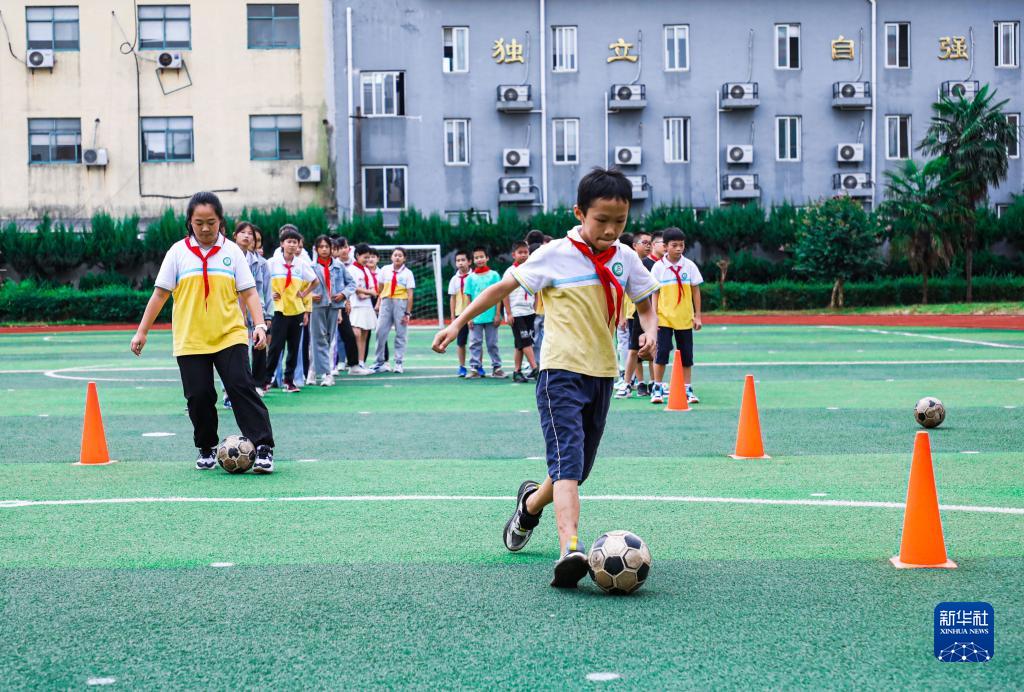 9月1日,浙江省湖州市吳興區東林鎮東林二小的學生們在“開學第一課”上參加足球繞樁比賽。