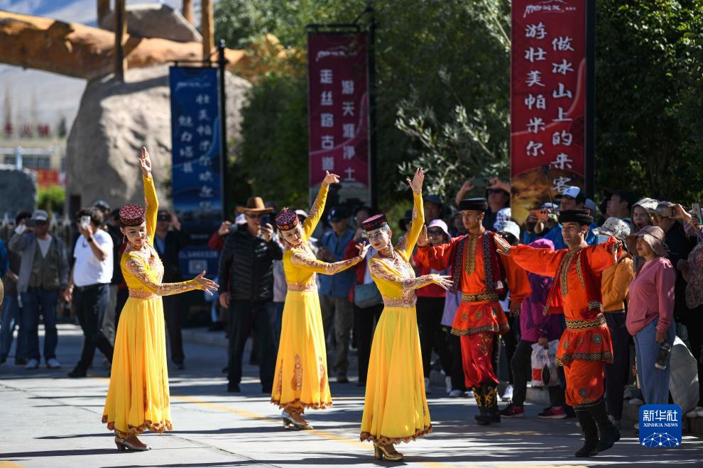 在新疆塔什庫爾幹塔吉克自治縣帕米爾旅游區游客服務中心,文工團演員跳舞歡迎游客(8月29日攝)。