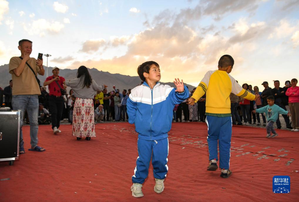 小學生跟着大人們一起在新疆塔什庫爾幹塔吉克自治縣奇石廣場跳舞(8月31日攝)。