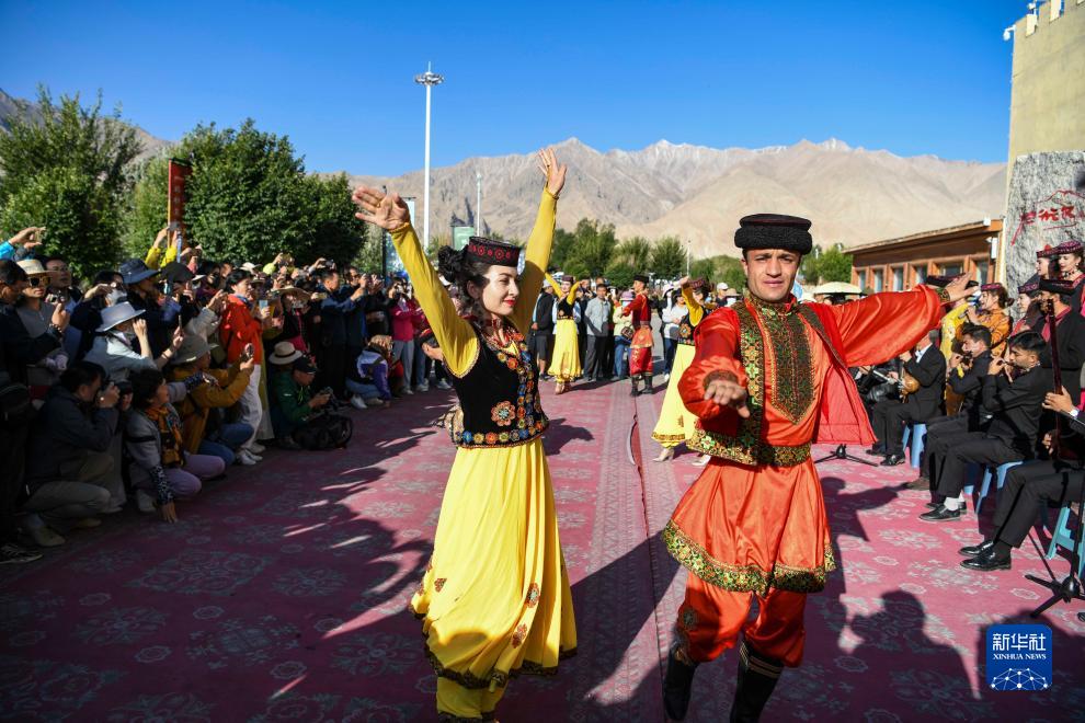 在新疆塔什庫爾幹塔吉克自治縣帕米爾旅游區游客服務中心,文工團演員跳舞歡迎游客(8月31日攝)。