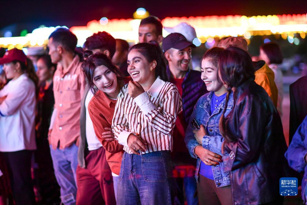 人們在新疆塔什庫爾幹塔吉克自治縣奇石廣場圍觀跳舞的人群(8月30日攝)。