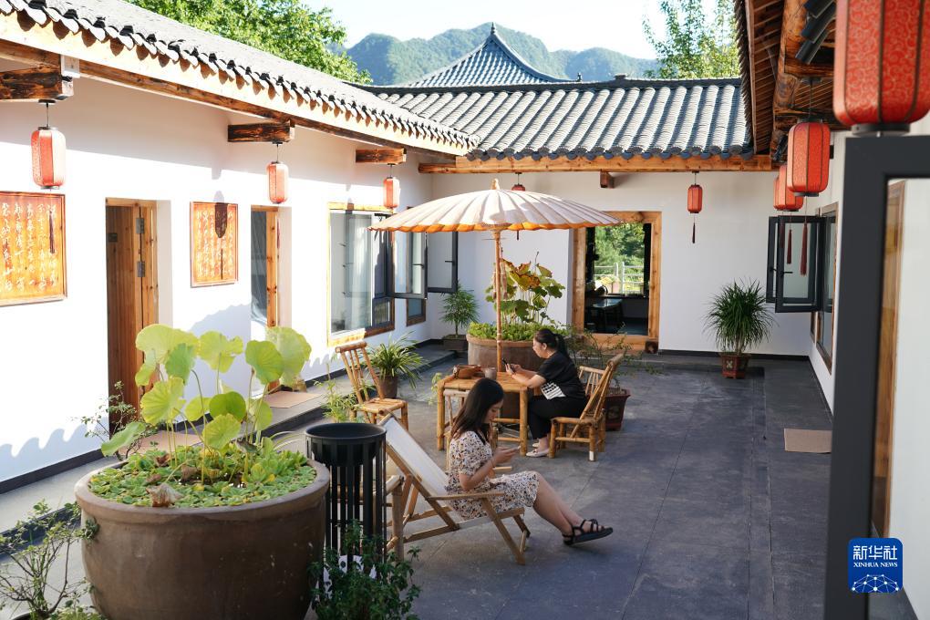 8月31日,游客在旬陽市構元鎮羊山村一家民宿內休閒游玩。
