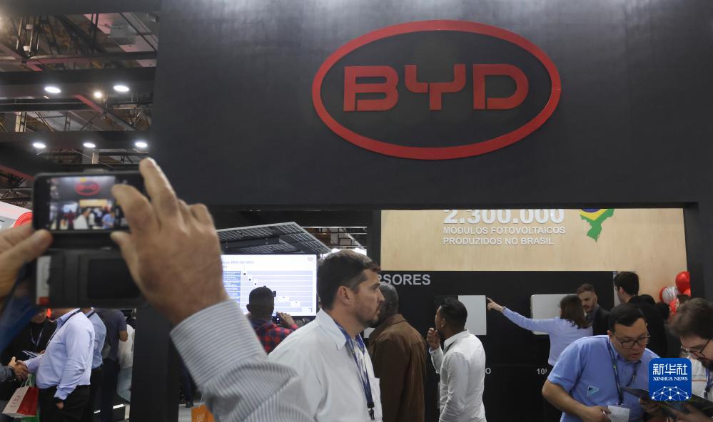 8月30日,在巴西聖保羅舉行的第十屆南美國際太陽能展上,一名參觀者拍攝比亞迪展&。
