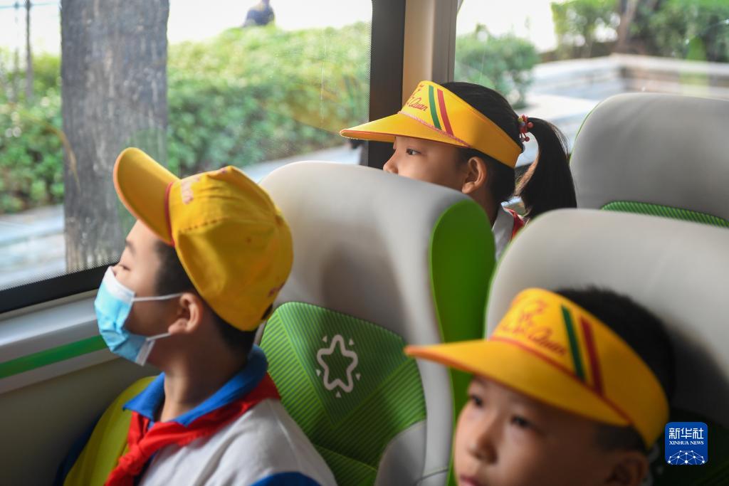 9月1日,幾位北京市豐台區第一小學的學生在通學公交車上向外張望。