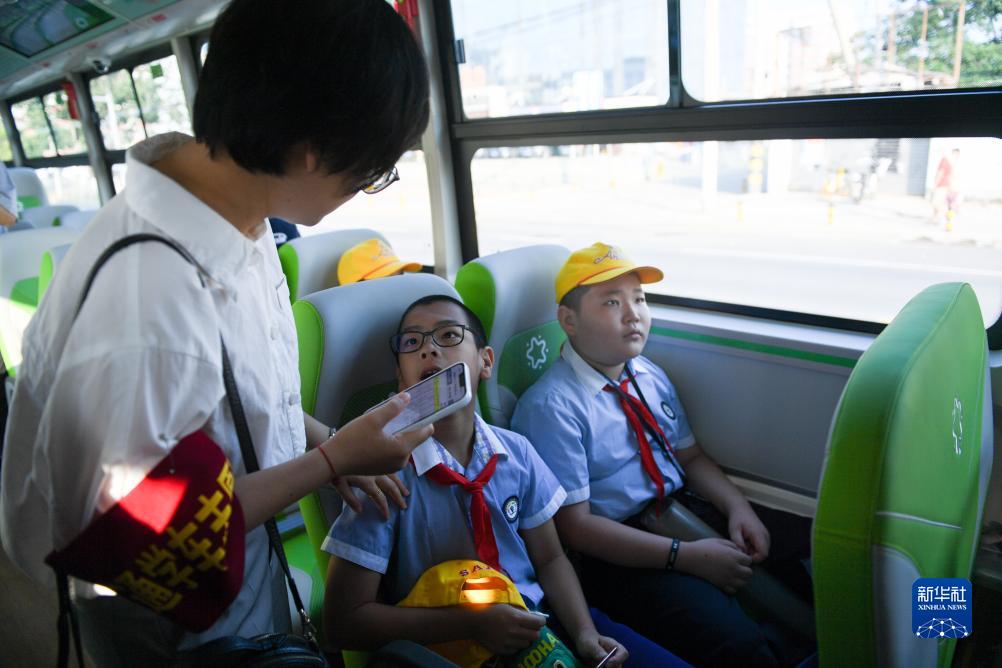 9月1日,在北京市豐台區一輛通學公交車上,北京市豐台區第一小學的老師(左)在核對乘車的學生信息。