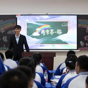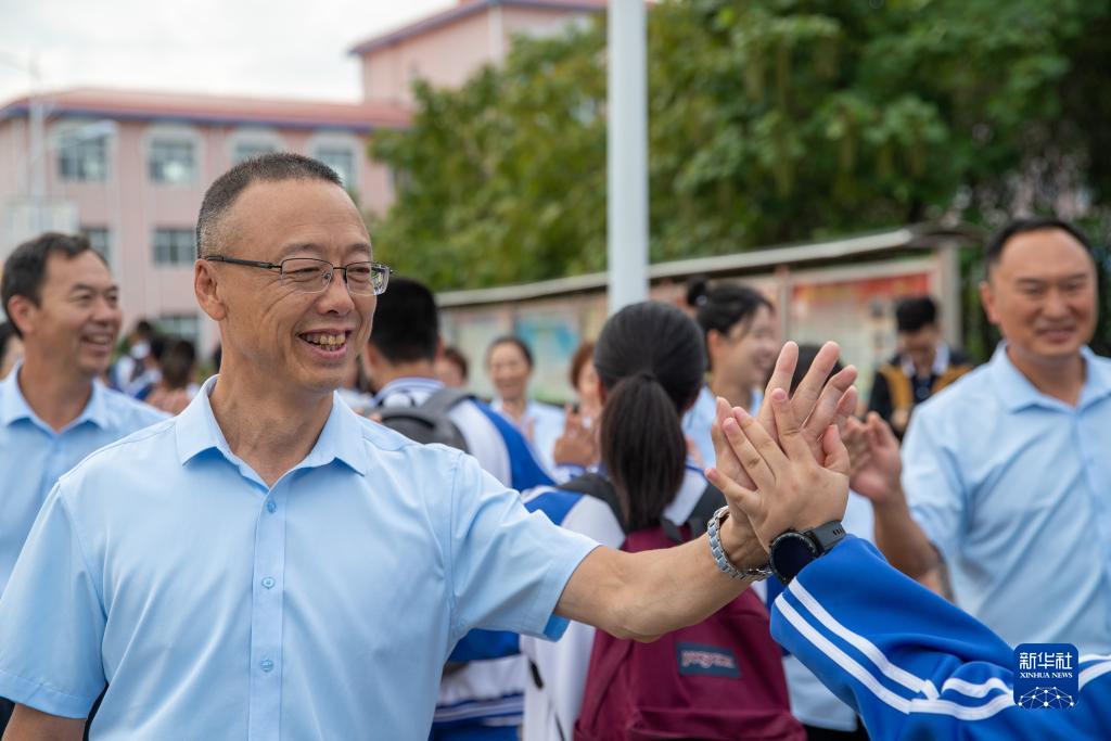 9月1日,在哈爾濱市延壽縣第四中學,教師與學生擊掌。