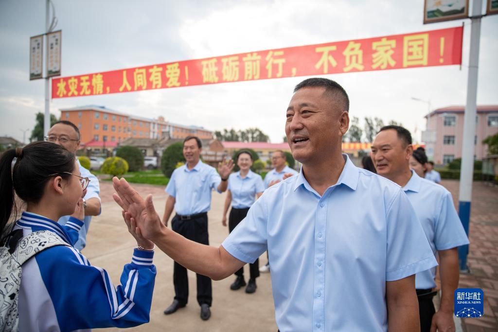 9月1日,在哈爾濱市延壽縣第四中學,教師與學生擊掌。