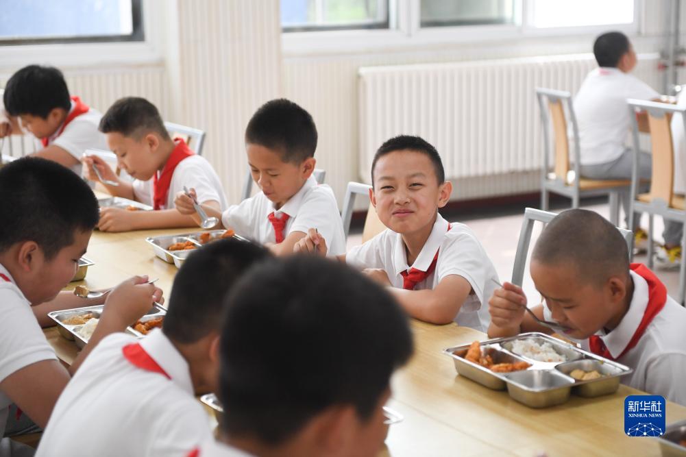 9月1日,在北京市房山區霞雲嶺鄉霞雲嶺中心小學,小學生在裝修一新的食堂內吃飯。
