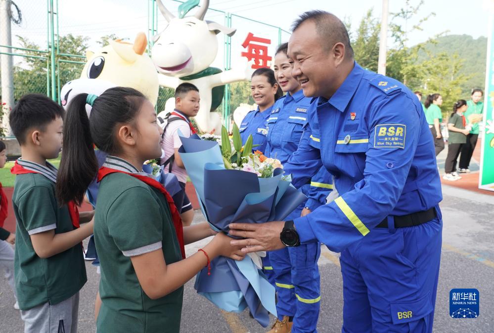 9月1日,在北京市門頭溝區京師實驗小學,學生向門頭溝區藍天救援隊隊員獻花。