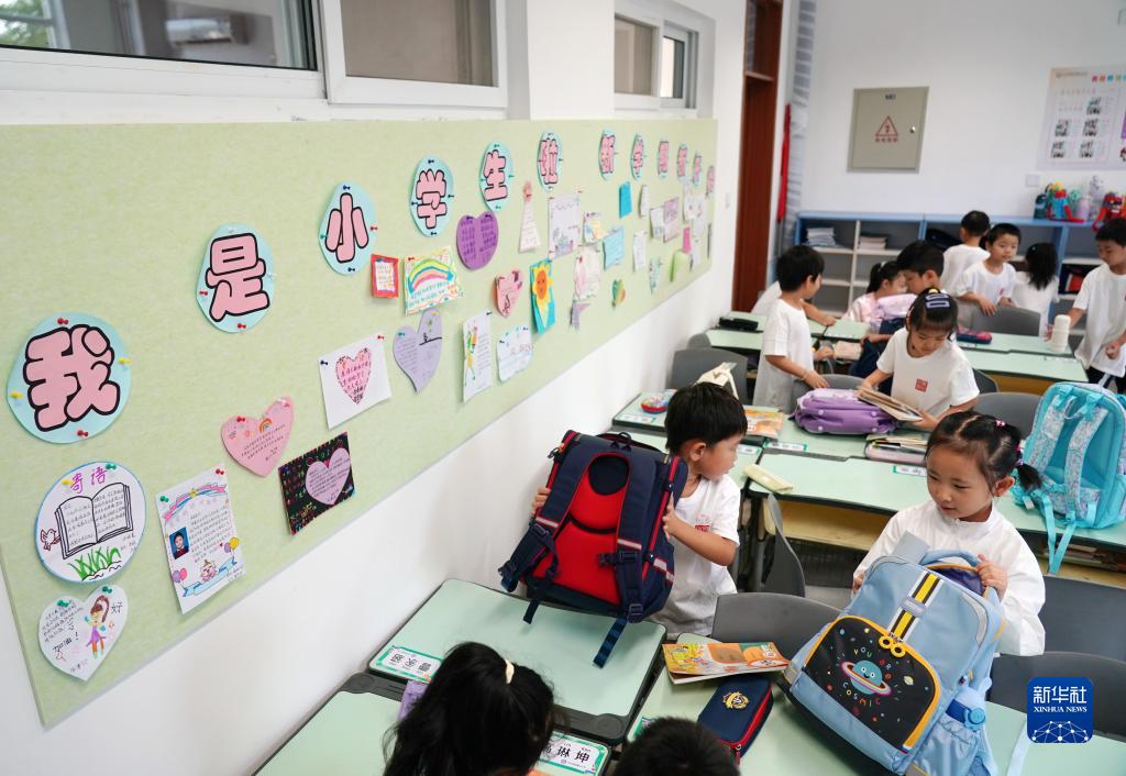 9月1日,在京師實驗中學借址開學的門頭溝區黑山小學的學生在京師實驗中學的教室裏做開學準備。