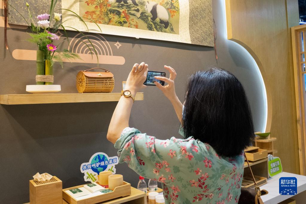 9月1日,觀眾在國家會議中心國際竹藤組織展&拍攝竹制展品。