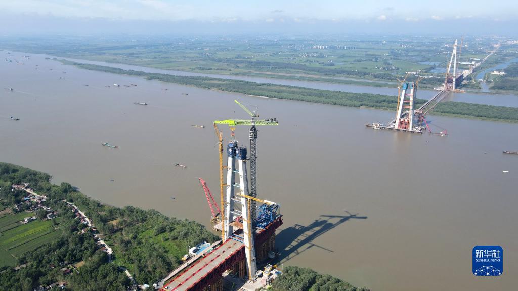 這是9月1日拍攝的中交二航局巢馬城際鐵路馬鞍山公鐵兩用長江大橋南主塔首節段鋼塔吊裝現場(無人機照片)。