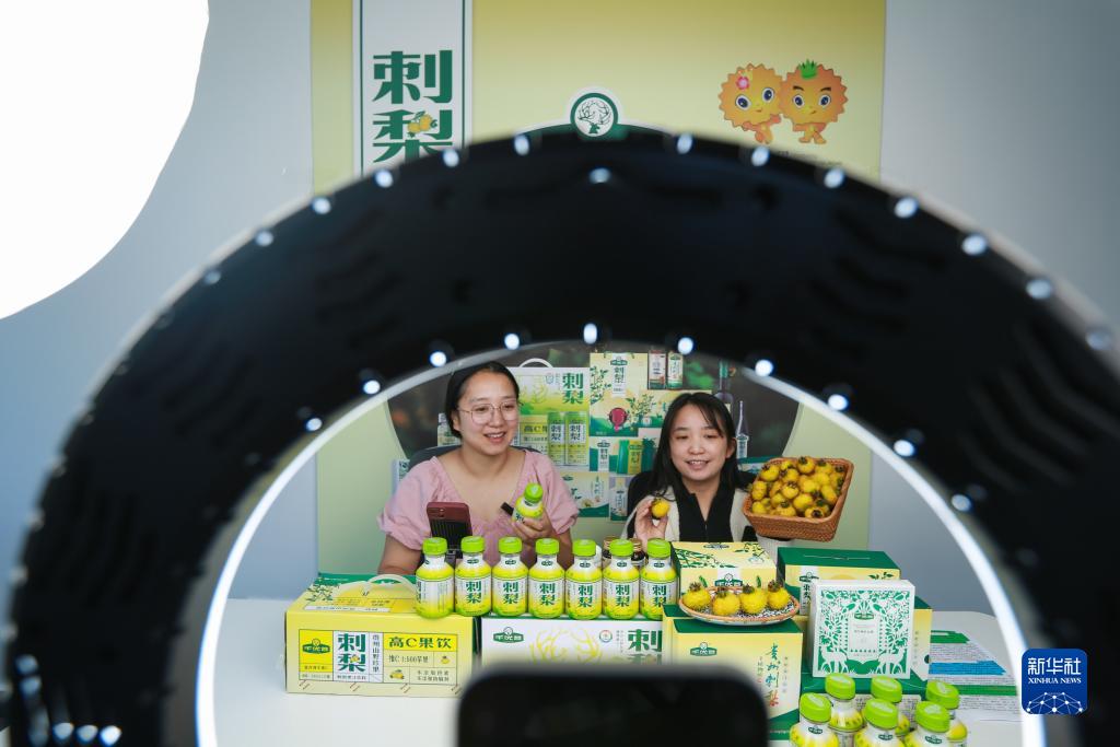 9月1日,在貴州省龍裏縣谷腳鎮茶香村刺梨展銷中心,當地政府工作人員與刺梨基地工作人員直播推介刺梨産品。