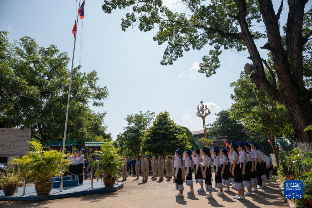 9月1日,學生們在老撾首都萬象一所學校參加開學升旗儀式。
