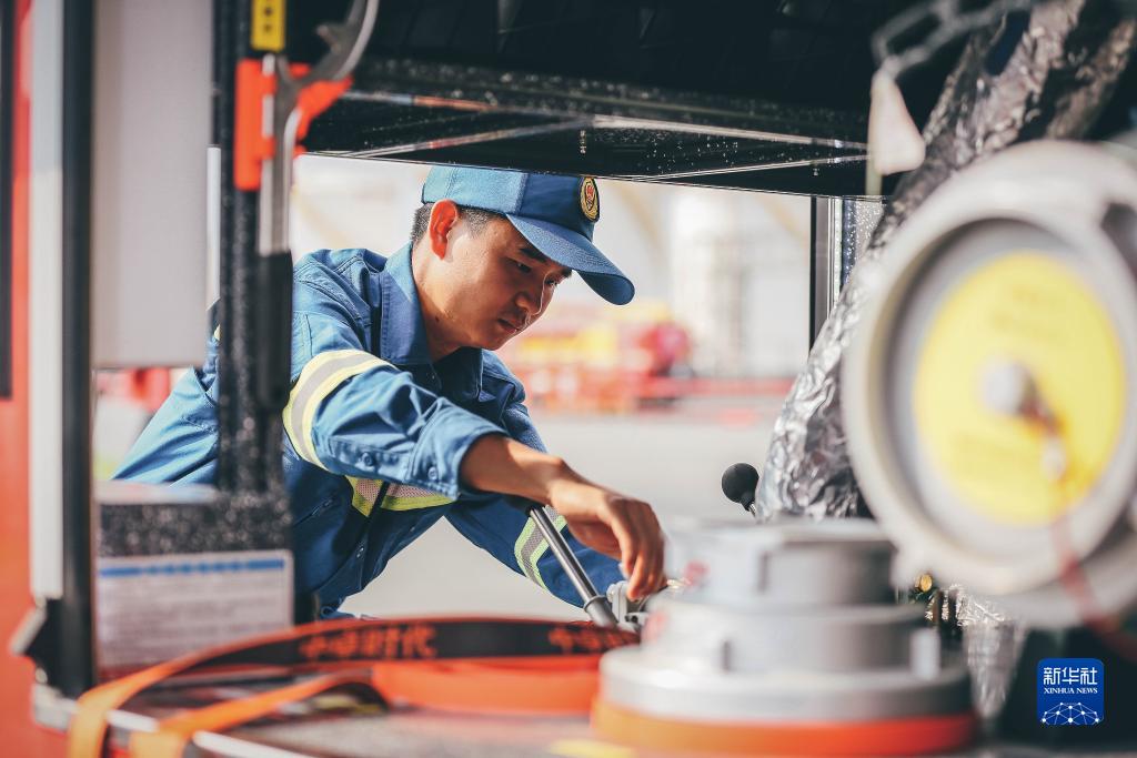 專業技術保障分隊隊員展示檢修消防車水閥(8月31日攝)。