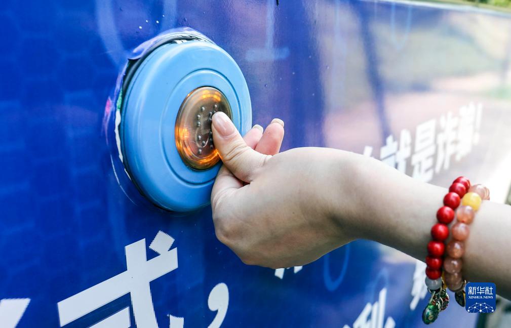 9月1日,在江蘇蘇州的勞動路實驗小學公交車站,乘坐輪椅的乘客在車外按下無障礙公交車外帶有盲文的按鈕準備乘車。