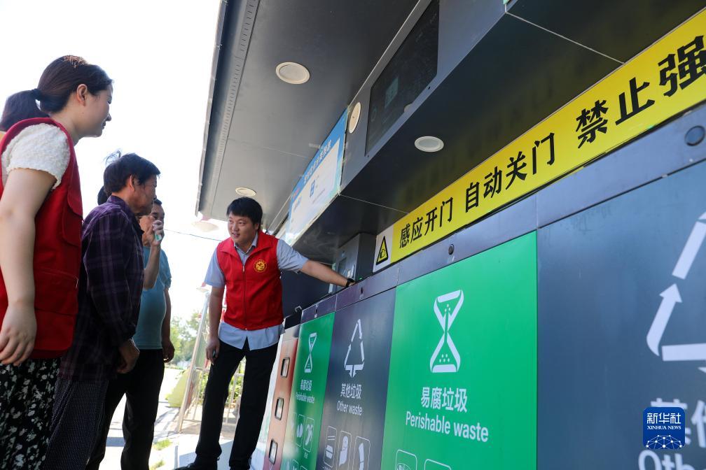 9月1日,在莊墓鎮棗林社區,志願者指導居民使用智能垃圾分類回收設備。