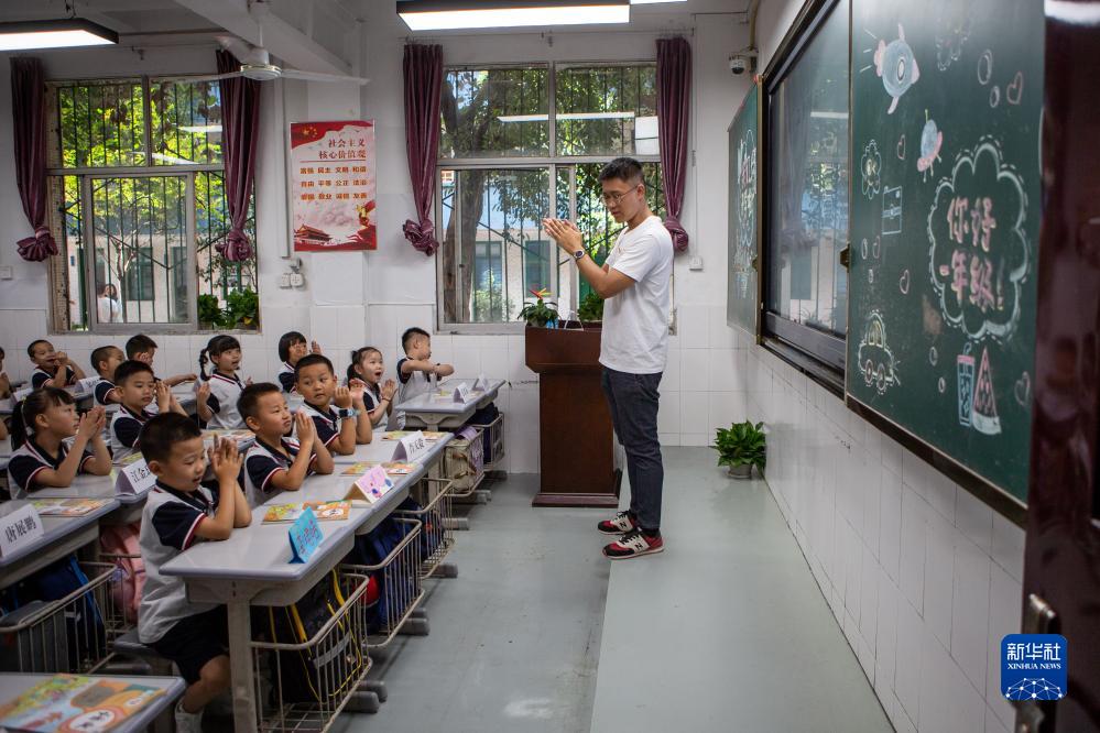 9月1日,在重慶育才實驗學校華岩校區,豆豆(右三)在教室內上課。