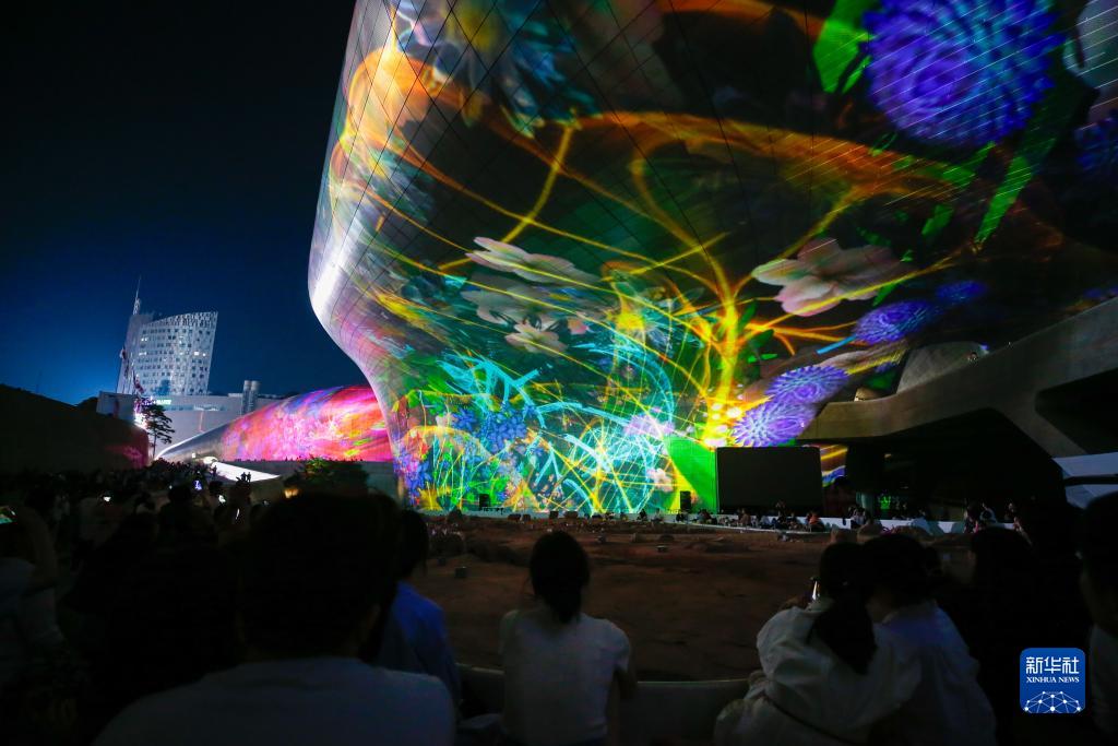 當日,大型新媒體藝術燈光秀“首爾之光·2023秋季”在韓國首爾東大門設計廣場亮相。燈光秀充分利用建築的曲面外墻,融合煙霧、燈光、影像和音樂,吸引人們到現場參觀。該燈光秀將持續到9月10日。