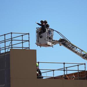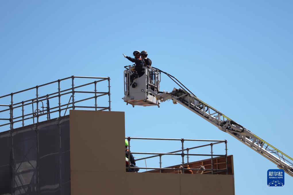 9月1日,在日本神奈川縣相模原市,消防員演練用消防雲梯車救下被困高樓的民眾。