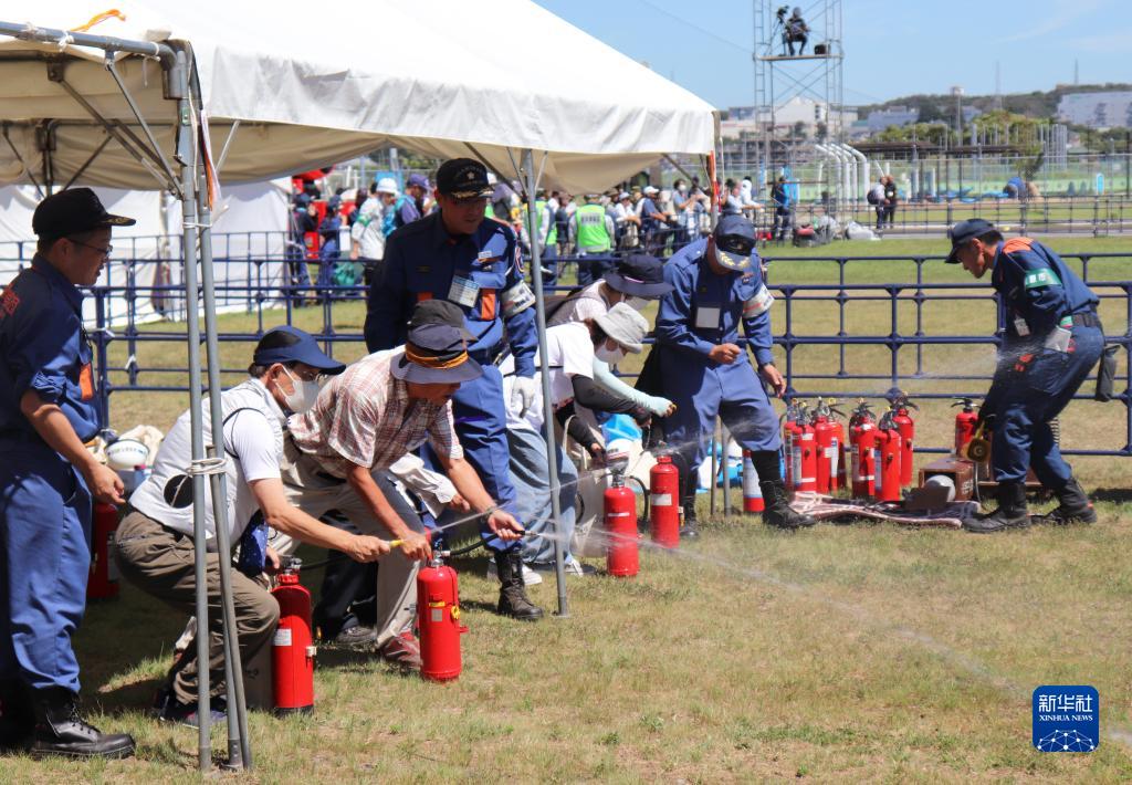 9月1日,在日本神奈川縣相模原市,民眾學習使用滅火器。