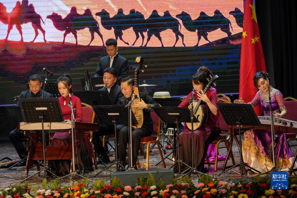 8月31日,演奏者在尼泊爾首都加德滿都的“絲路花語”中國民族音樂專場演出上奏樂。