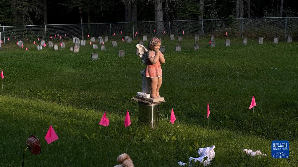這是8月31日在加拿大薩斯喀徹溫省博瓦爾印第安人寄宿學校舊址拍攝的用粉色旗子標出的疑似兒童和嬰兒墓地。