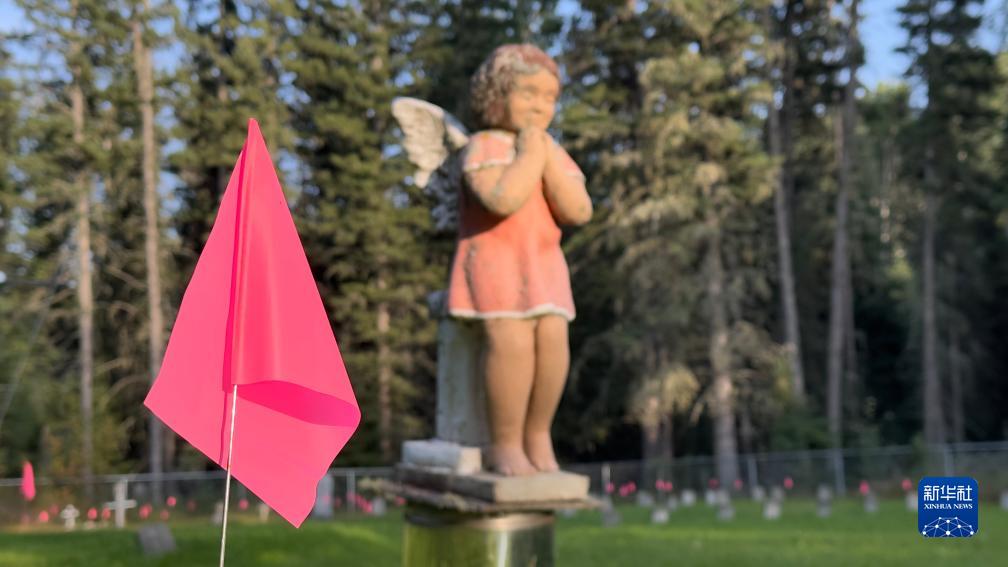 這是8月31日在加拿大薩斯喀徹溫省博瓦爾印第安人寄宿學校舊址拍攝的用粉色旗子標出的疑似兒童和嬰兒墓地。