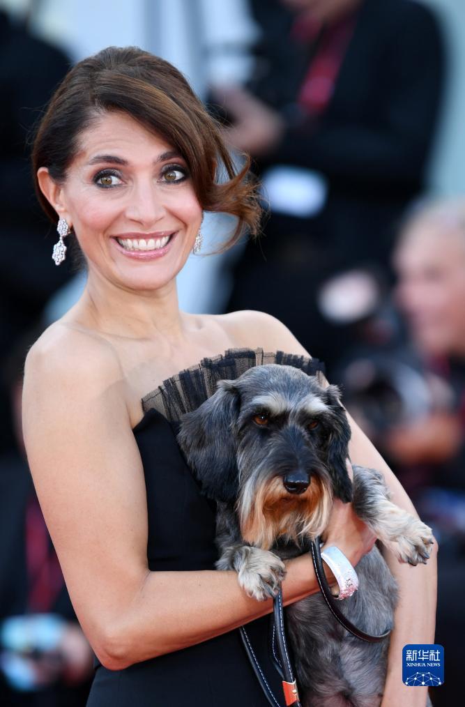 9月1日,在意大利威尼斯,演員卡泰麗娜·穆裏諾抱着寵物狗亮相電影《可憐的東西》首映式紅毯。