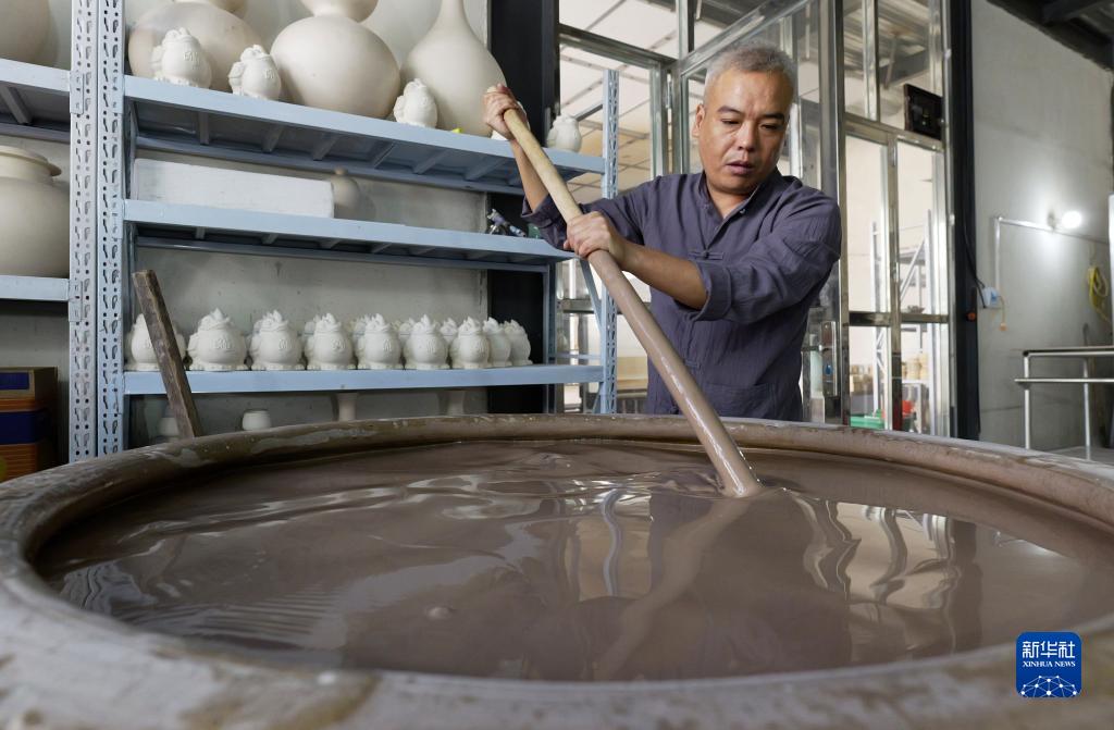 8月31日,在清涼寺村的一家汝瓷生産企業,汝瓷藝人王佔穩在車間裏準備施釉。
